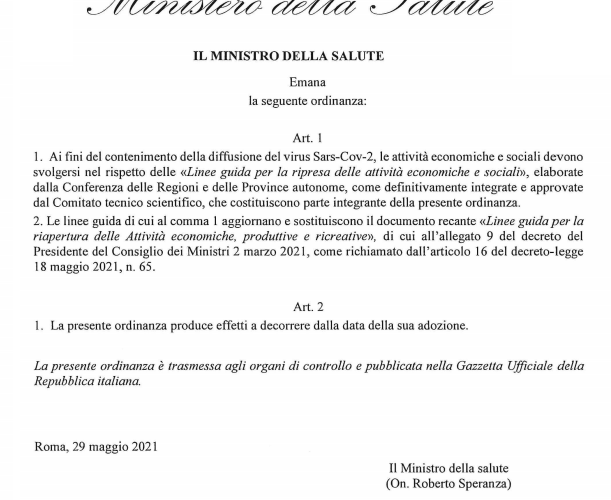 LINEE GUIDA PER LA RIPRESA DELLE ATTIVITA’ ECONOMICHE: NUOVA ORDINANZA DEL MINISTRO DELLA SALUTE DEL 29 MAGGIO 2021