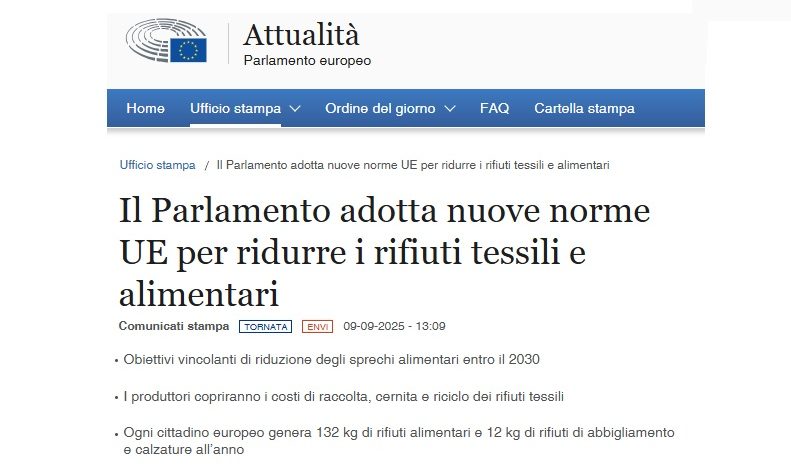 Il 9 settembre il Parlamento europeo ha approvato in via definitiva nuove misure per prevenire e ridurre i rifiuti alimentari e TESSILI in tutta l’UE. Gli Stati membri avranno 20 mesi dall’entrata in vigore per applicare le norme nella legislazione nazionale. In base alla presente Direttiva, i produttori che immettono tessili sul mercato UE dovranno sostenere i costi di raccolta, cernita e riciclo, tramite nuovi regimi di responsabilità estesa del produttore, da istituire in ciascuno Stato membro entro 30 mesi dall’entrata in vigore della direttiva. Le norme si applicheranno a tutti i produttori, anche quelli che operano via l’e-commerce e indipendentemente dal luogo di stabilimento. Le microimprese avranno un anno supplementare per adeguarsi. Le nuove regole riguarderanno abbigliamento e accessori, cappelli, calzature, coperte, tende, biancheria da letto e da cucina. Su iniziativa del Parlamento, i paesi UE potranno estendere i regimi di responsabilità estesa del produttore anche per i materassi.